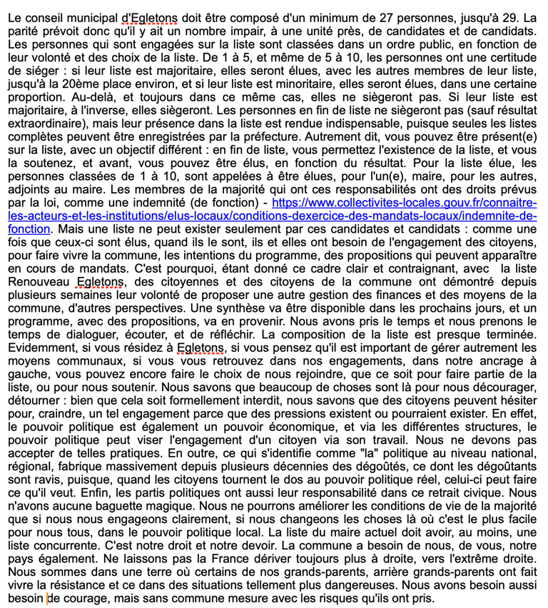 Récemment, via le marché hebdomadaire, des individus ont distribué des tracts de soutien pour un affairiste d'extrême-droite, condamné à plusieurs reprises par divers tribunaux. Les affirmations qu'il répète, liées à celles d'un parti bien connu, visent des étrangers, au motif qu'ils sont pauvres, d'une autre religion que chrétienne. Elles doivent être rejetées avec force et sans ambiguïté. Notre commune est peuplée de personnes nées ici, d’autres sont arrivées de départements voisins et certaines de bien plus loin, parfois au péril de leur vie. Nous partageons un but commun : vivre dignement et en paix. Ensemble, par l’action locale, nous démontrerons que les thèses de l’extrême droite n’ont lieu d’être ni ici, ni ailleurs.